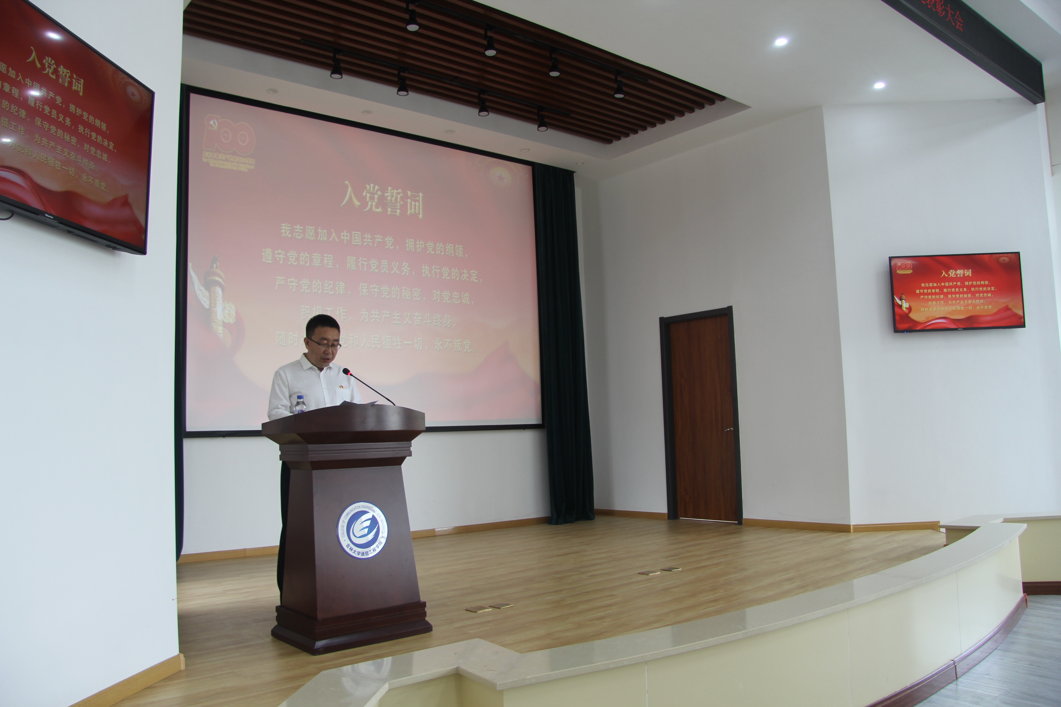 伴随着激昂雄壮的国歌,大会正式开始。随后,全体党员举起右手,面对着鲜红的党旗,庄严宣誓,激昂的宣誓声响彻整个会场。预备党员代表李卓菲同学代表全体新党员发言,她表示要恪守在党旗下的诺言,严格要求自己, 以行动践行入党誓言,肩负起党和人民的重托,为共产主义奋斗终身。