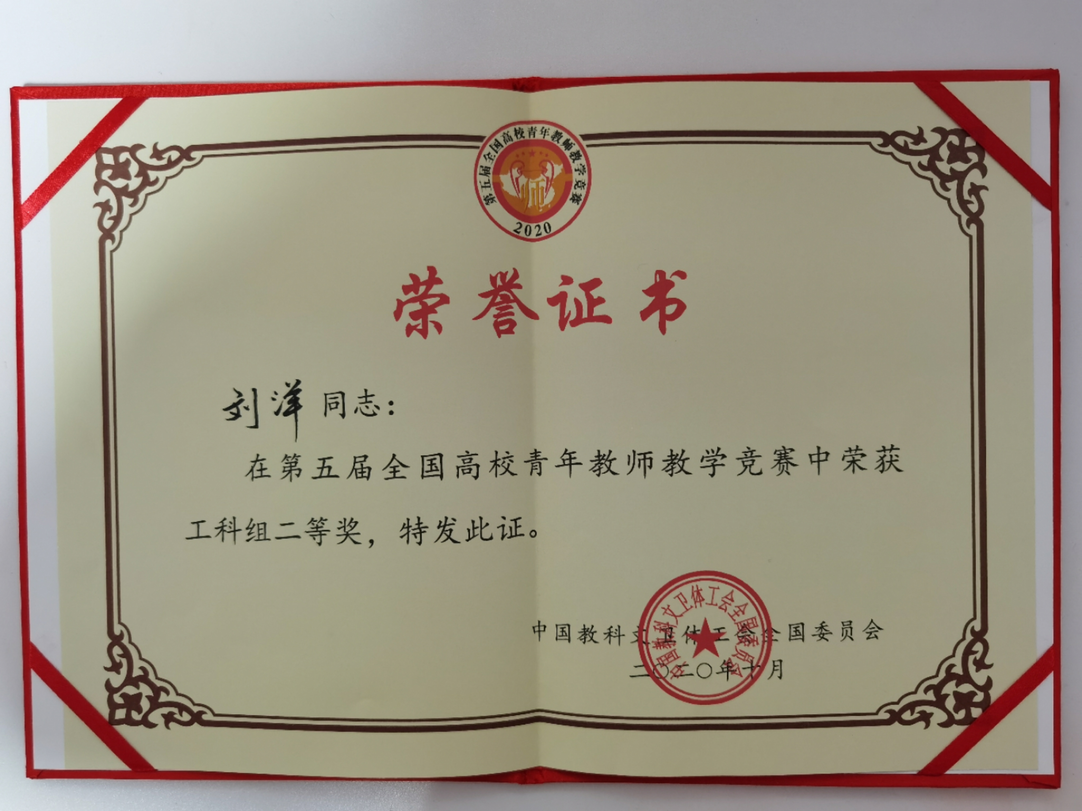刘洋老师经过院赛、校赛、省赛等层层选拔,取得了吉林省工科组第一名的成绩,并参加全国决赛,荣获工科组二等奖。