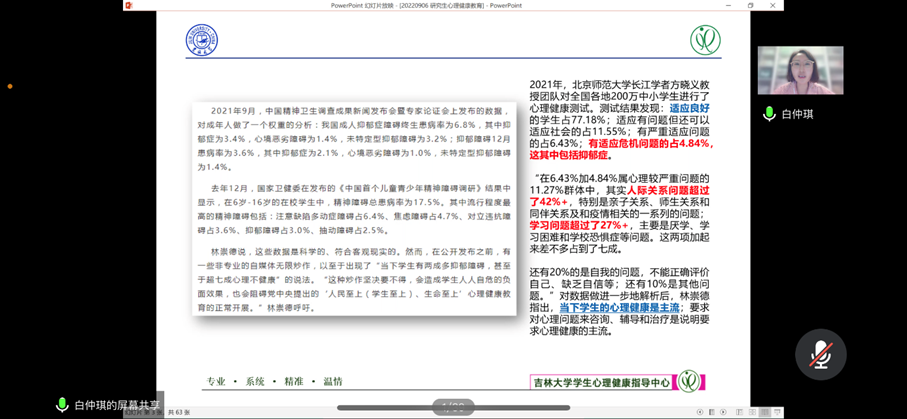 On 8 September, Bai Zhongqi, Deputy Director of the Student Mental Health Guidance Center of Jilin University, presented freshmen with a mental health education lecture at the College of Communication Engineering (CCE) invitation, aiming at popularizing knowledge about mental health, shaping freshmen’s correct concepts of mental health, and promote the harmonious development of their physical and mental health. The lecture was held online and attended by all postgraduate and undergraduate students enrolled in 2022, presided over by Liu Xingtong, Deputy Secretary of the CCEs CPC Committee.