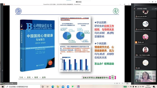 Ms. Bai began the lecture by introducing Chinese peoples mental health conditions. She presented the current mental health condition of adults and enrolled students through detailed and accurate data. Then she proposed two questions, i.e. What will our life be? and What should we do?. Based on the reality among students, Ms. Bai indicated two key factors causing the anxiety of contemporary postgraduate students. While drawing students attention, she used vivid cases and short videos to offer solutions to problems. In addition, she gave a more detailed explanation on how to achieve self-management by managing the goal, the time and the pressure, and how to make good use of resources of knowledge, social connections, and profession. Finally, Ms. Bai elaborated on many methods to deal with and mitigate pressure that emerged from circumstances such as the adaptive crisis, interpersonal relationships, and lack of confidence. It vividly explained how to establish good relationships, enhance students’ empathy in interpersonal communication, and enabled them to adapt to campus life quicker and better.