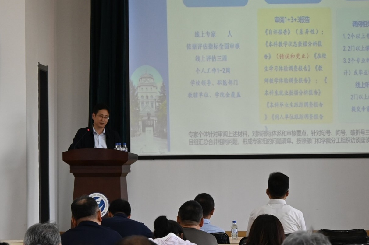 随后,特邀嘉宾金祥雷主任进行了主题报告。金主任详细解读了本科教育教学审核评估的工作要点,并从专家考察方式、教学质量整改标准、课堂教学、线上访谈等多方面进行指导。他的专业见解和丰富经验为学院迎评工作提供了宝贵建议。