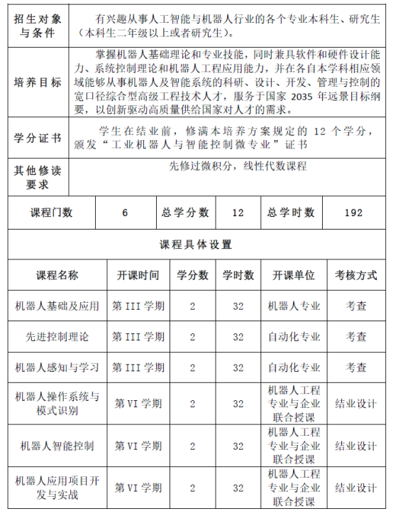 学员在完成学习前,修满本培养方案规定的12个学分,颁发“工业机器人与智能控制微专业”证书